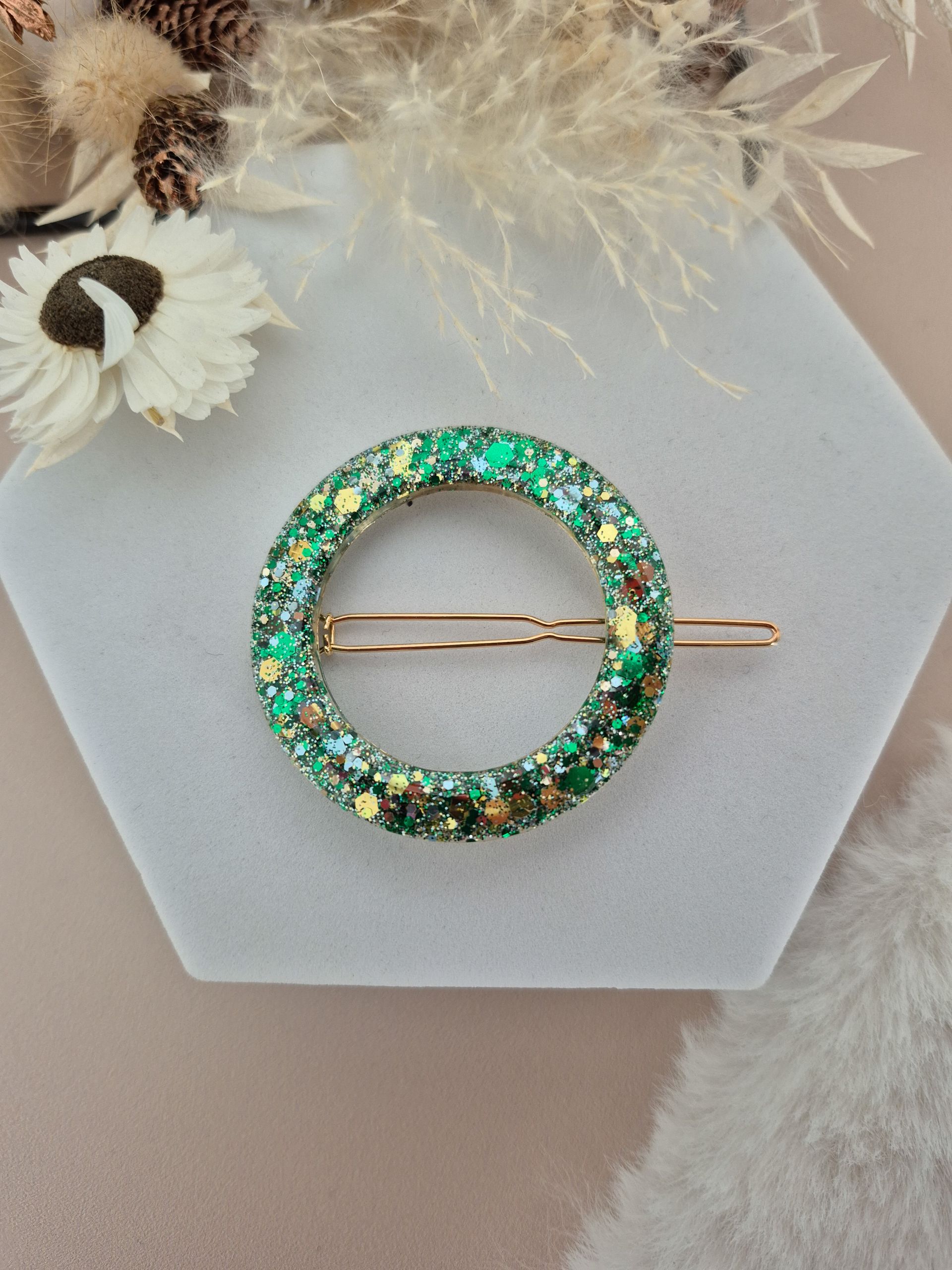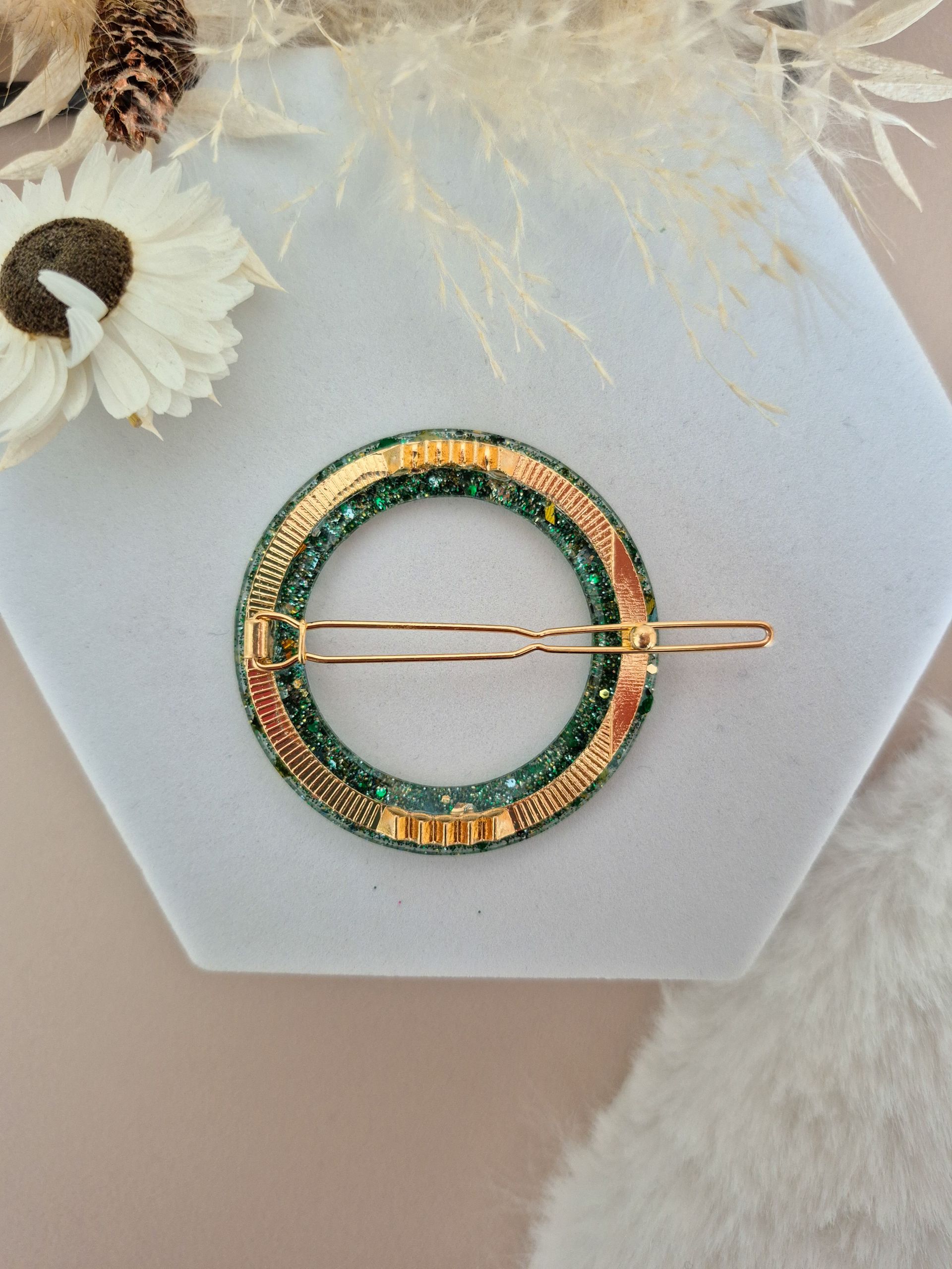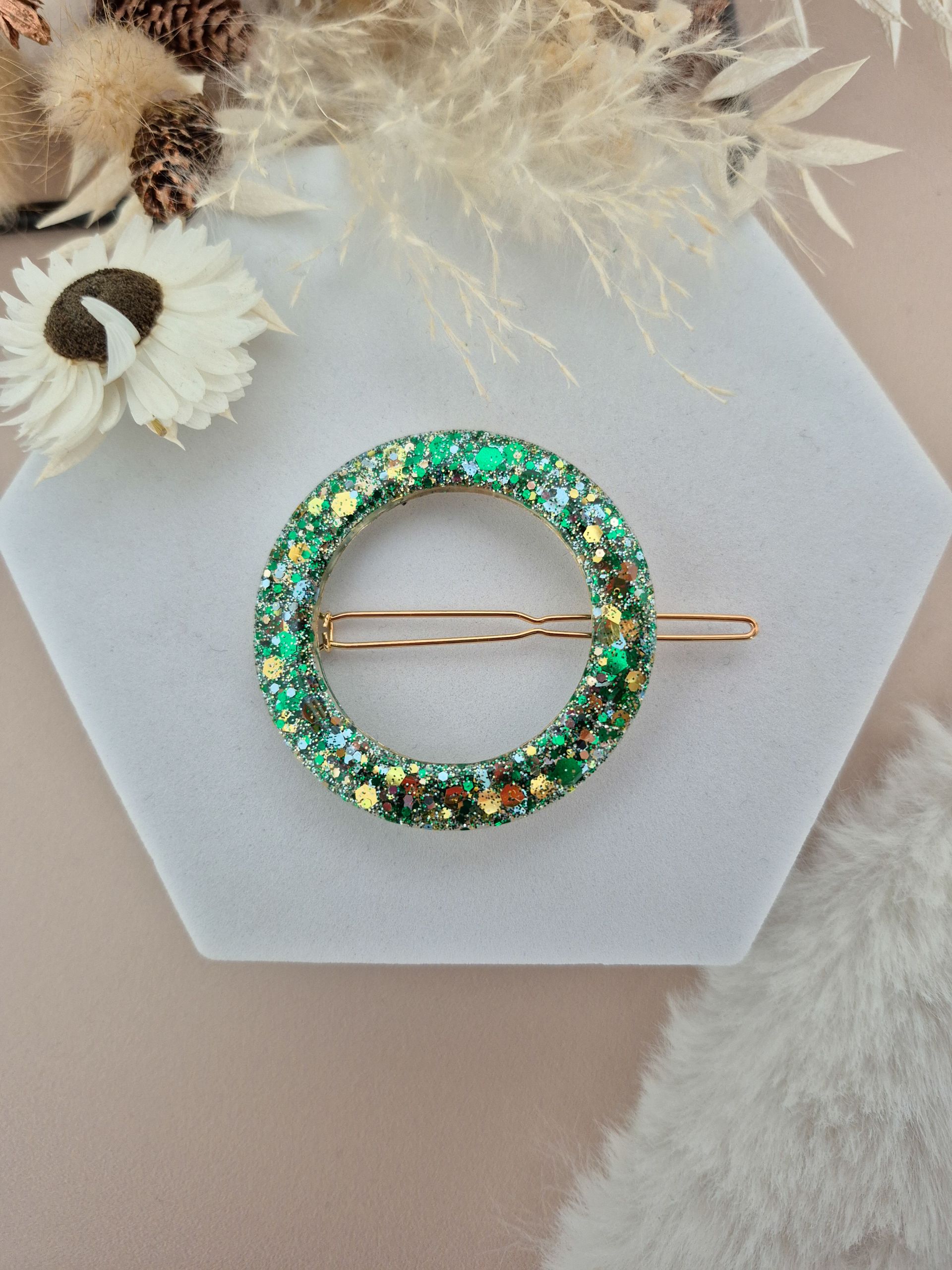 Chaque barrette est faite main, en résine de marque française, avec inclusion de paillettes.