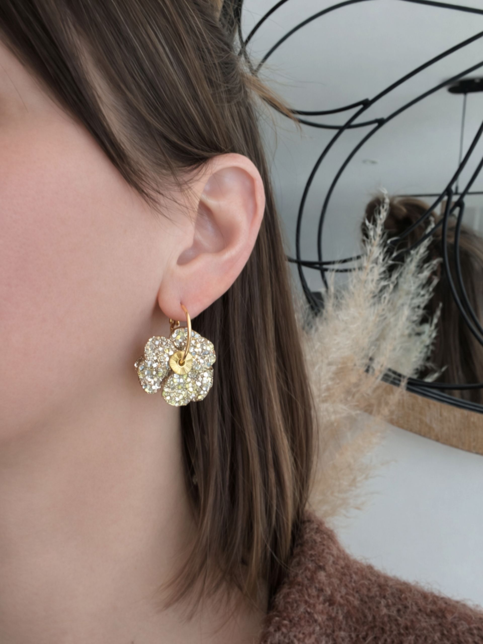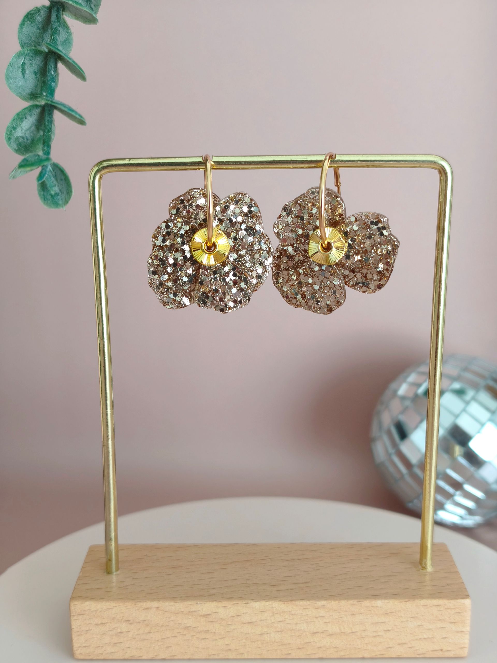 La fleur est faite main, en résine epoxy de marque française, avec inclusion de paillettes.