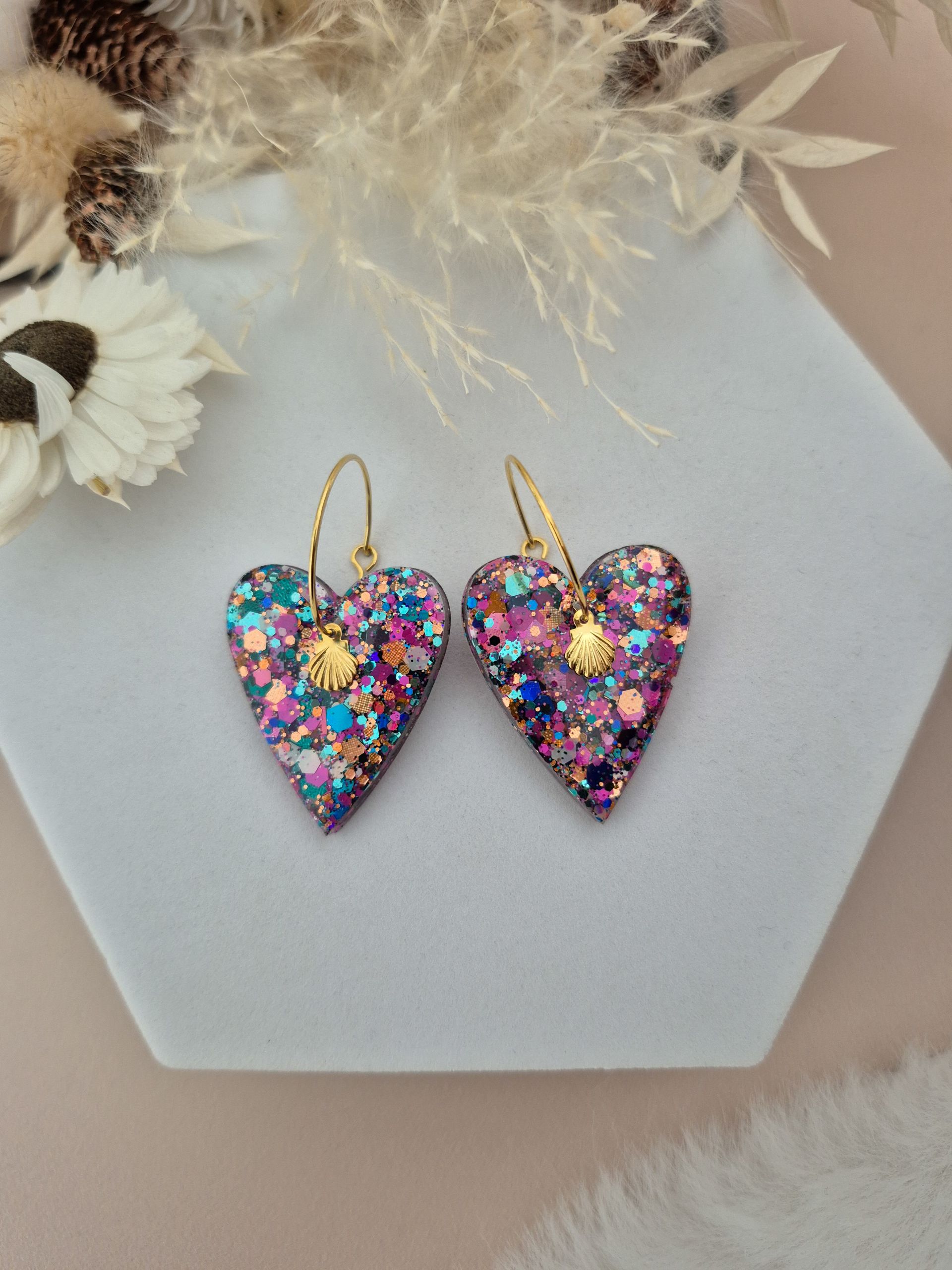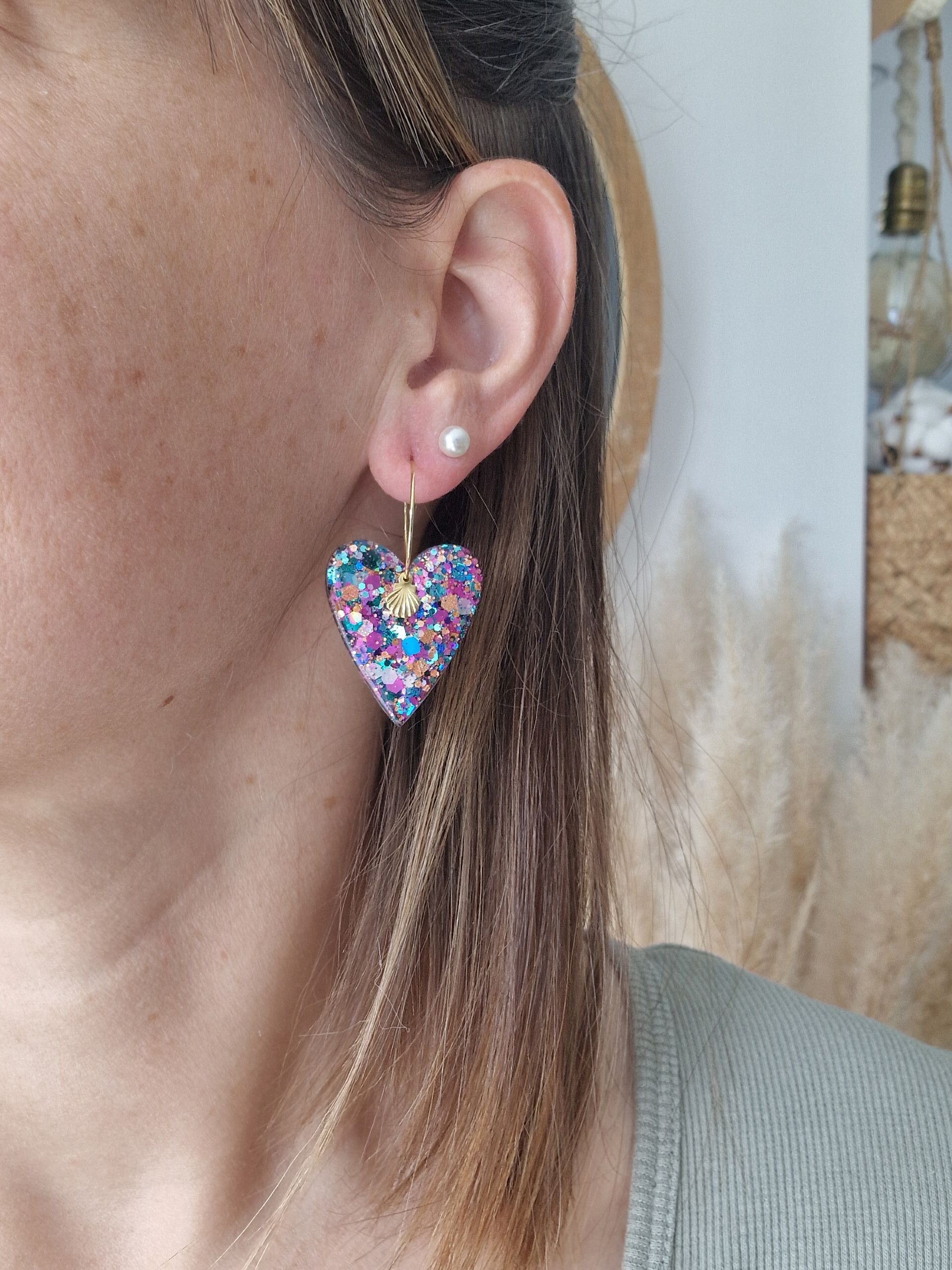 Succombez au charme de nos boucles d’oreilles Lili en forme de cœur, délicatement confectionnées en résine et ornées de paillettes scintillantes.
