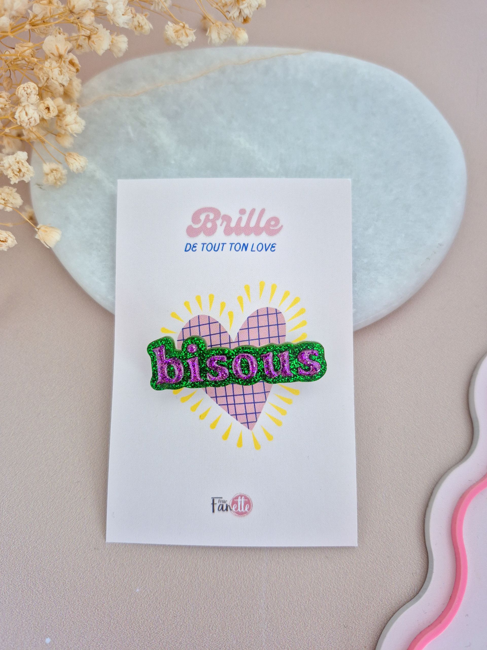• Design : Mot BISOUS ornée de paillettes.